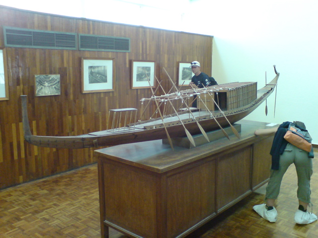 snacka om dinosaurie.. på museet vid pyramiderna kan man beskåda en skuta som de hittade i en grav 30m lång och ca 4000år ! bifogar en bild från originalet och en från modellen för att se hu man knöt ihop bordläggningen. laskarna mellan borden är superdelux med tanke på dåtidens verktyg.