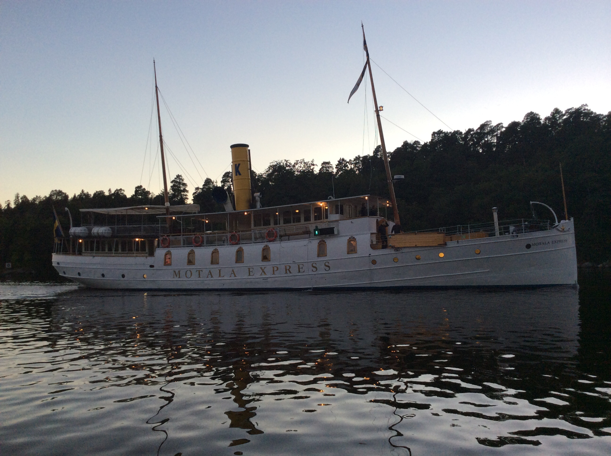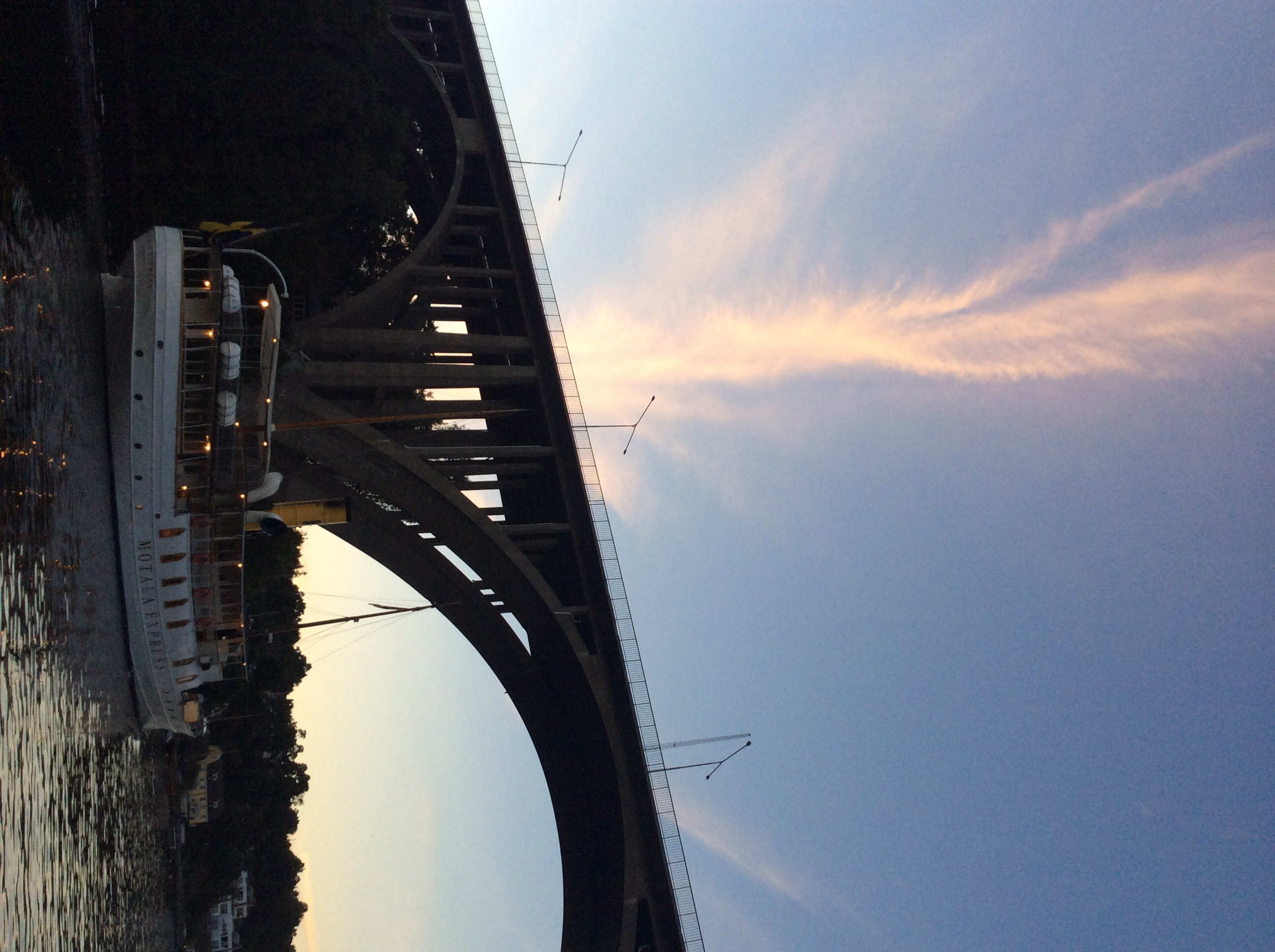 Sitter på Björknäs varf, skurusundet, och så glider Motala Express förbi, rycker handbromsen o sladdar runt efter passagen under Skurubron och stävar åter in mot stan. Påpasslig båtolog som man är åkte paddan fram.