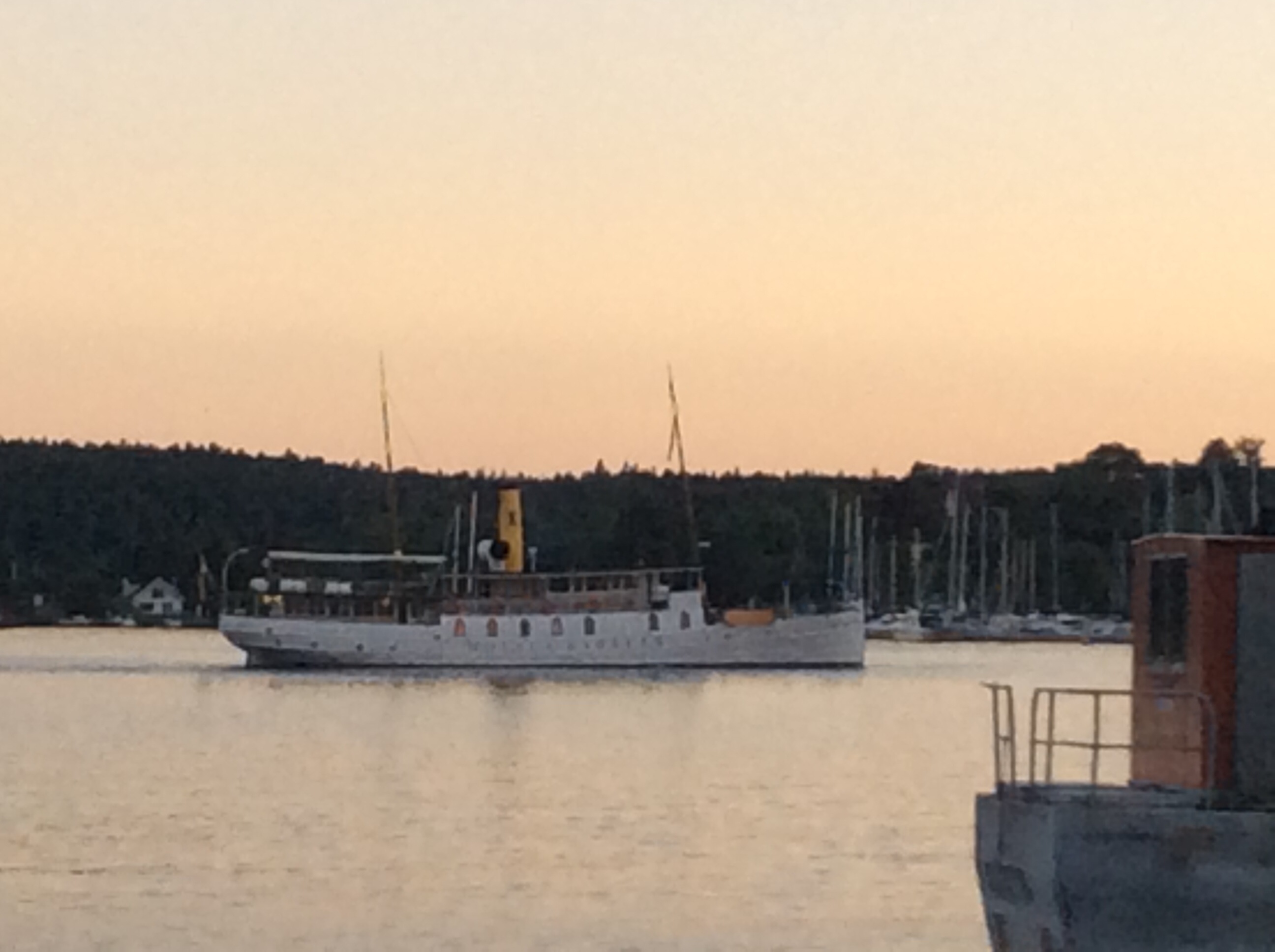 Utan bild.. Såg just Aurora, liten passagerarbåt i kanalen väster ut. Igår passerade ornö Karlstads busstrafik österut över Vättern.. Såld till Stockholm?