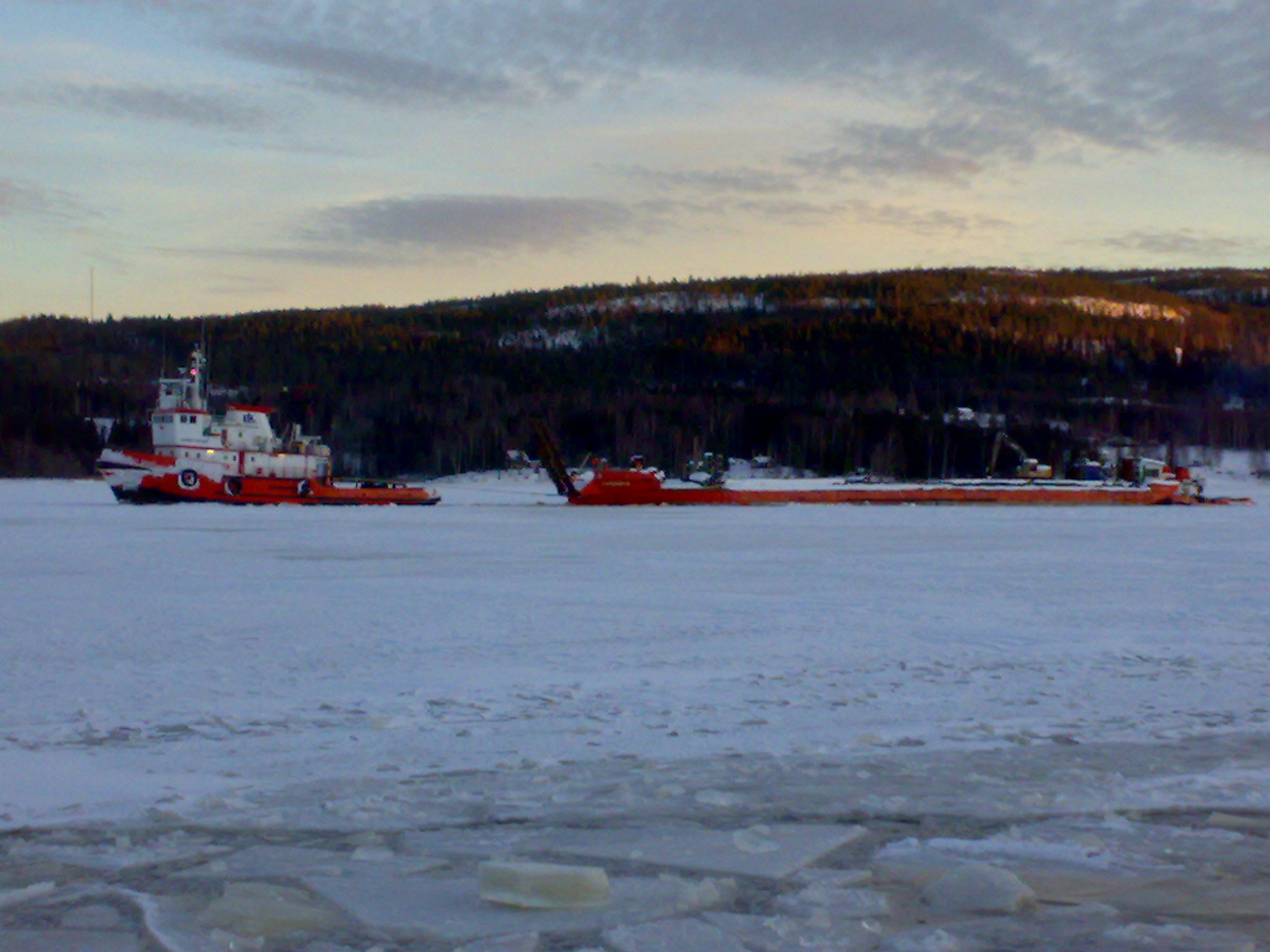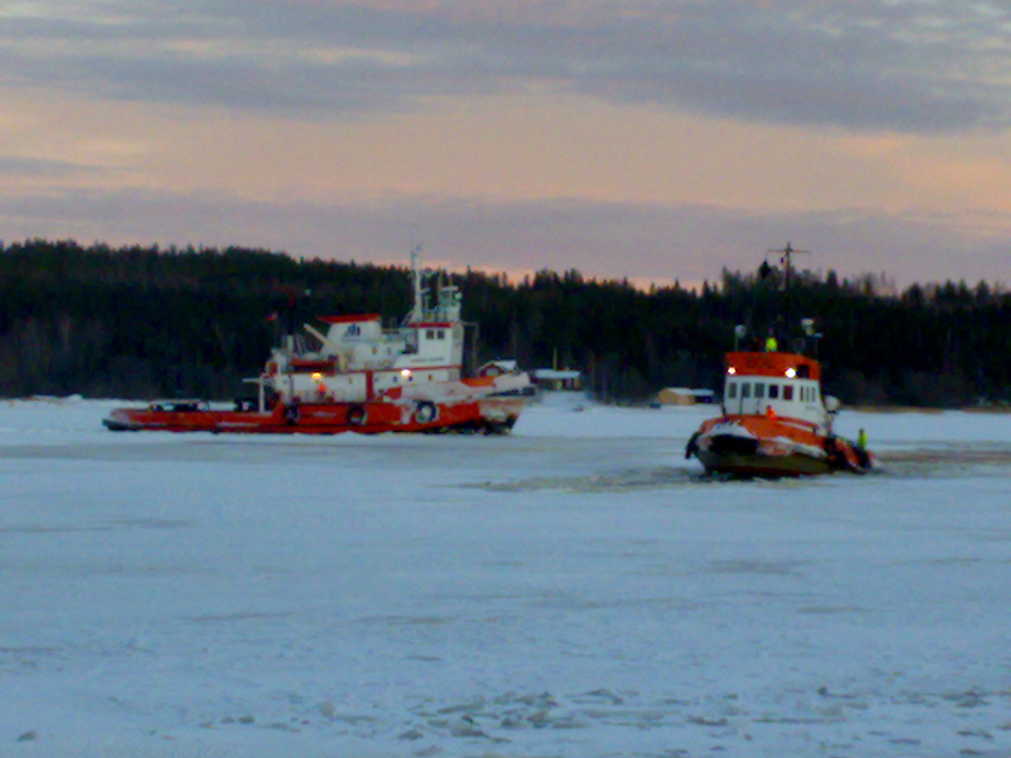 Jag kan väl komplettera vad Jonny skrev i samband med bilderna. Isens tjocklek sista biten in till kajen i Docksta var 30-40 cm. Pråmen lämnades ute på fjärden och Eol fick klara sista biten själv.