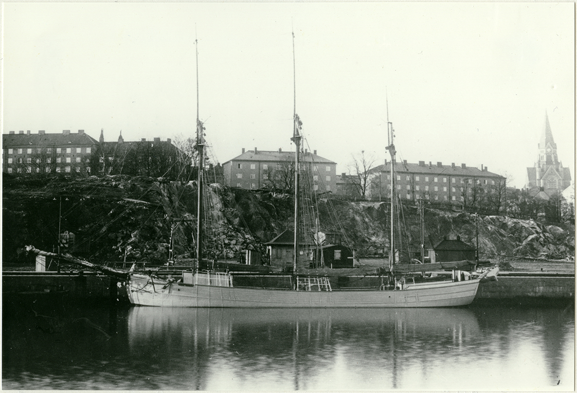 Ur mitt minnes gömmor grävde jag fram en kandidat. Skrovform och proportioner stämmer, och jag kan inte hitta någon annan motsvarande kandidat. Dock har jag har inte sett henne med det "fönster-arrangemanget" på styrhytten, vilket förvirrar, så jag kan vara helt fel ute (eller så byggde man om styrhytten på henne någon gång på 50-talet (?)). Så man kanske ska ge någon annan äran av att svara rätt?