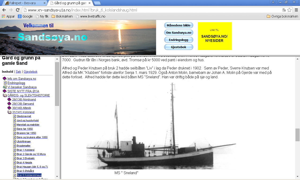 Genom att googla på Sneland så hittade jag en kutter med det namnet. Men inte heller där framgår varifrån uppgifterna kommer. Hemsinan heter Sandöya.no och där står följande om Sneland: