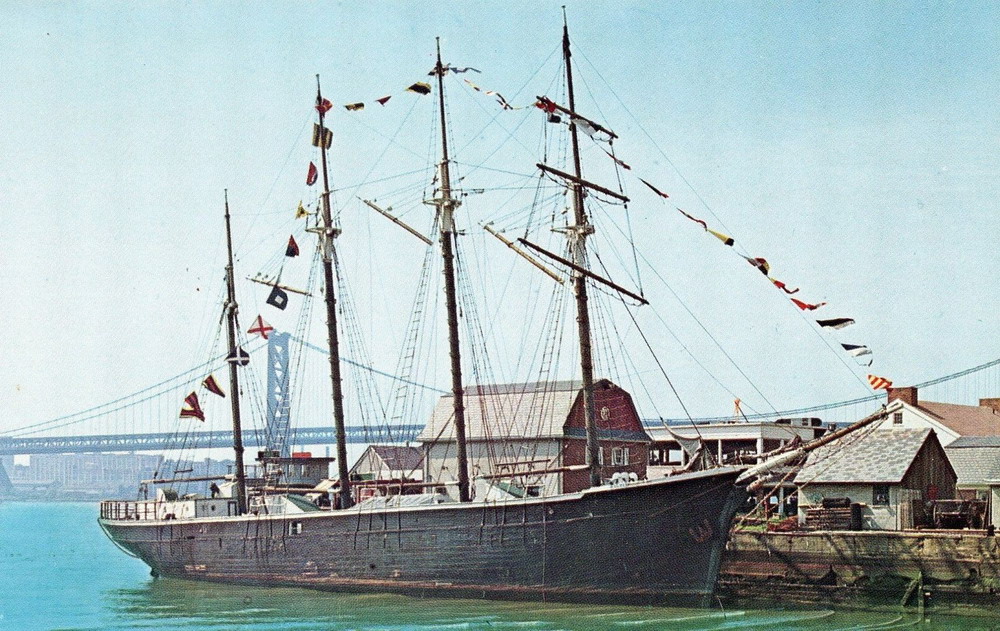 To complete the old timey atmosphere, a four-masted early 20th century Swedish schooner, “The Sonja,” above, was docked on the north side of the pier. The Sonja served as a floating cocktail lounge. It sat in the dock for a few years after the 1700 complex closed, forlorn and abandoned. In 1975 it was damaged by fire and later that year was struck by a freighter and heavily damaged to the point where it could no longer be restored.