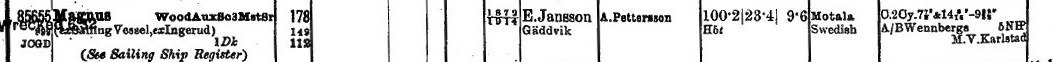 MAGNUS ex INGERUD, regnr 899, 178 brt, b 1872 Gäddevik, pr Alfred Pettersson, Motala; strandat/förlist den 19 juni 1932 vid Bålsö.