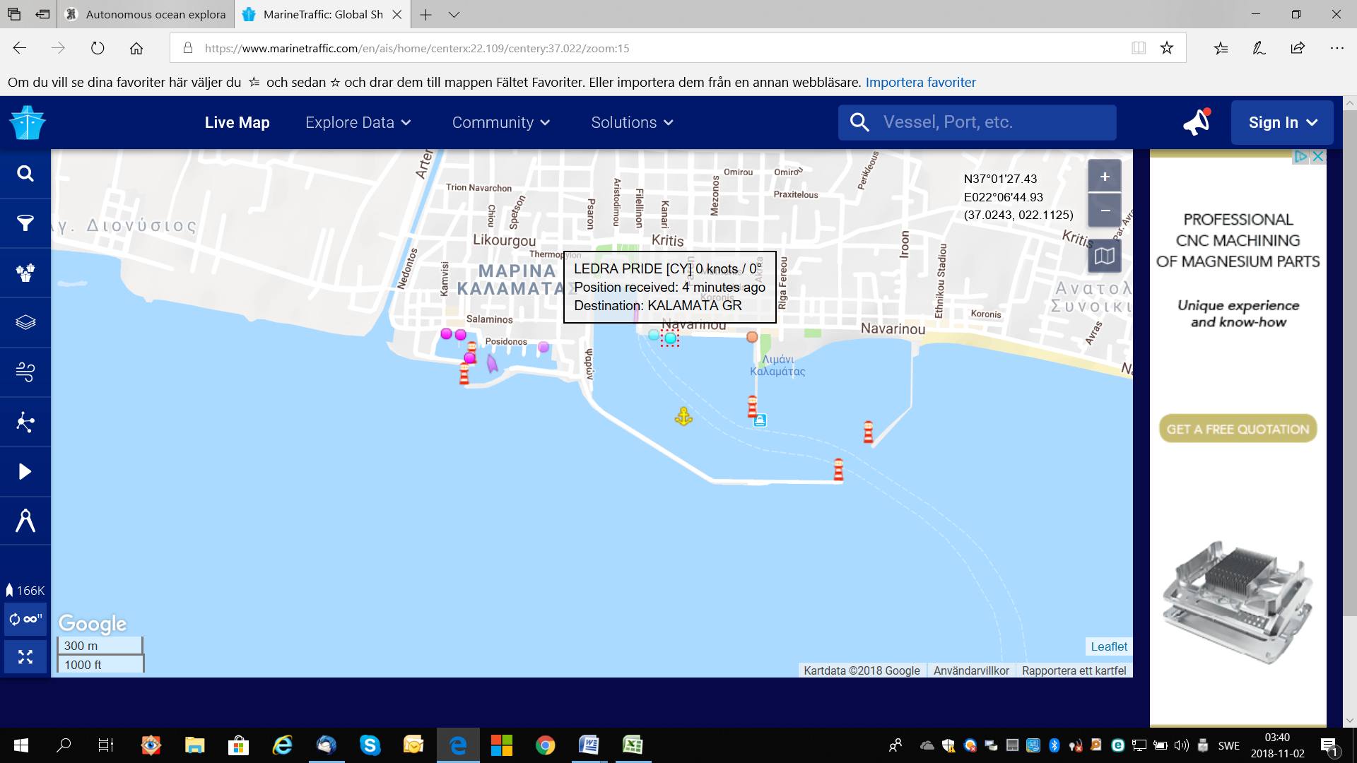 Det ser konstigt ut men det är den bild man får upp när man sätter pekaren på henne. Hon har varit ute under gårdagen och kört ca 15 distansminuter utefter vår sida av viken men var tillbaka på eftermiddagen i hamnen och ligger där nu. Prova att gå in på Marine Traffic och se på Kalamata så får du upp henne liggande bredvid Ledra Rride. Jag skickar med en bild på hur det ser ut i hamnen nu inatt. Den blå pricken är Ledra Pride, den ännu ljusare är den vi pratar om som på Marine Traffic heter USV M samt på tvärkajen ser man lyxkryssaren Sapphire.