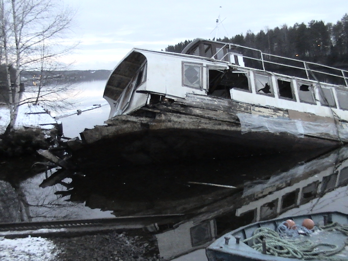 - Skrovet håller inte att dra i. Här har stora delar av fören slitits bort
