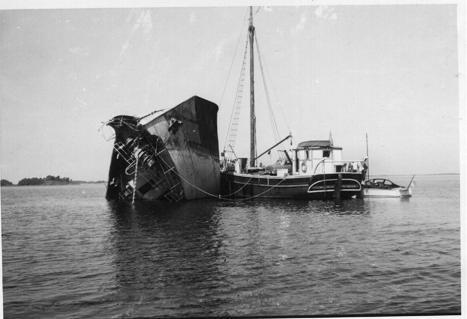 olyckan hände 23/10 1959 strax söder om Stångudden ,hon stog runt efter grundstötningen och bogserades sedan flytande upp och ner till den plats vid Bratten där man sen alltså försökte vända henne rätt !