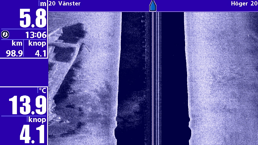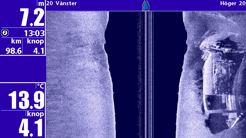 Lägger med några Side scan bilder på vraket idag , skrovet har sjunkit djupt i leran så det har bildats en djup grop där det ligger !