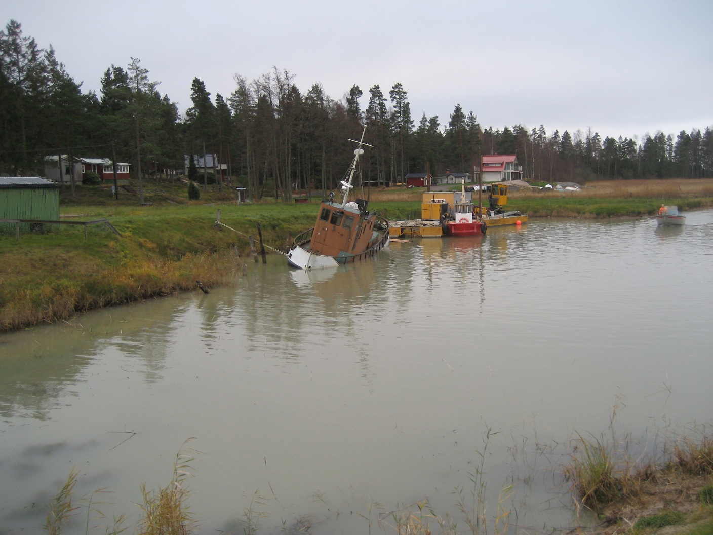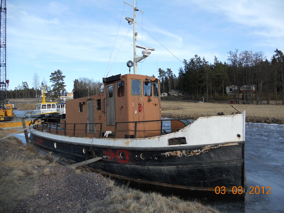 Hon heter "RASK" sjönk för nått år sedan på platsen där hon ligger p.g.a. att vattnet i Vänern sjönk så hon blev hängande på strandkanten med slagsida och någon ventil under vattenytan. Enl- vad jag hört bor ägaren i USA. Skall enligt uppgift ha en ganska ny Penta diesel, men i vilket skick den är nu vet jag ej. Tror inte den konserverades eller något efter länsningen. Bör väl gå att få fart på om den inte frusit sönder, det är ju fäsrkvatten i Vänern som är lite snällare mot metall.