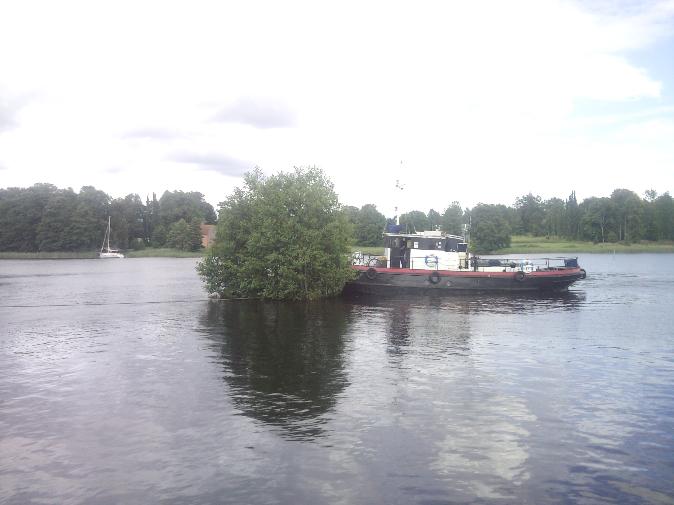ö-n var ej förtöjd vid bogerebåten utan knuffandes halvlyckat framför bogen. problemet var att botten ca 3m ner tog emot och ö-n tippade bara när kingcaben drog o Årås knöka. de höll på en bra stund me o böka upp den på grund o sen förtöjde man Ö-n i ett träd i strandkanten..