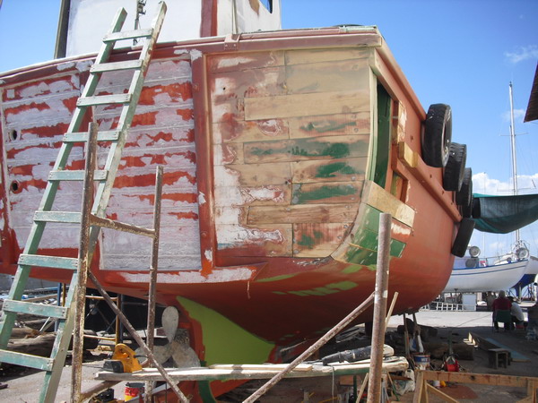 Dags att rapportera hur det går båtreparationerna nere vid varvet i marinan. Det har gått ganska lång tid sedan jag var där, bl.a har jag varit i Sverige i 5 veckor. Men idag var jag nere och tittade och fick även lite knapphändig information. Som ni ser så har det gått framåt och stora delar av förskeppet under vattenlinjen har blivit utbytt. Man har tagit bort den kraftiga avbärarlisten på en del ställen och man har kommit igång med akterspegeln. Jag såg bomullsgarn hängande i fogarna mellan borden och frågade om detta. Det är bara bomull som duger fick jag till svar. Det verkar som man bottnar med bomull och därefter fyller ut med nåt modernare. Över de färdiga delarna stryker man rikligt med grundfärg. Det jag såg idag såg bra ut. Undrar just om man skall föra i ordning däcket också? Vi får se.