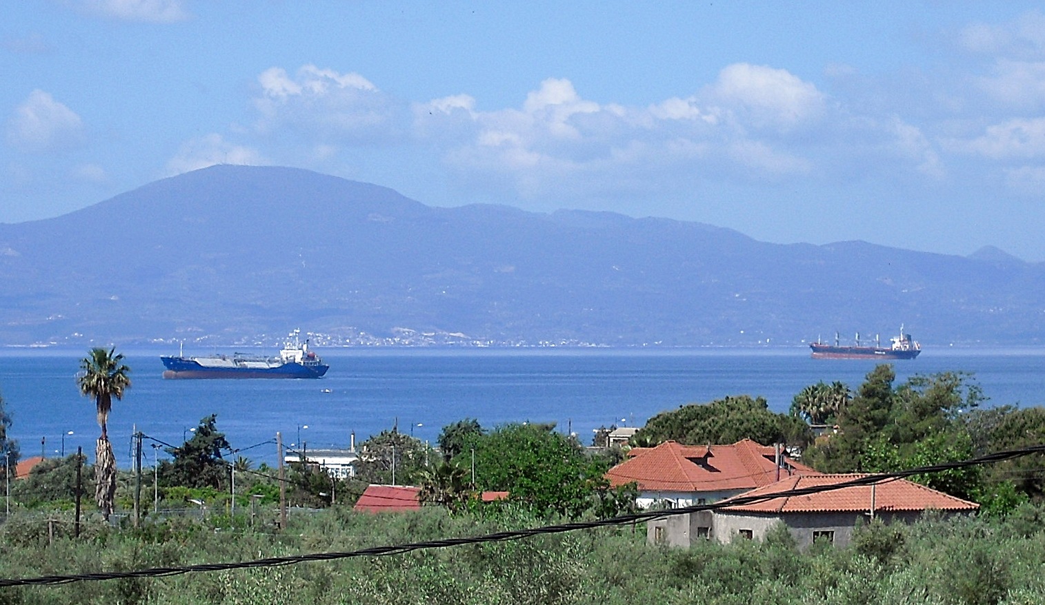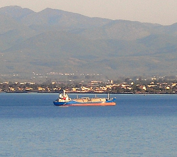 På väg till Lidl idag på förmiddagen fick jag det här bilderna av Pgc Strident Force och Saadet C. Det är mindre avstånd än på vår balkong. I bakgrunden ser man den lilla staden Petalidi. Det betyder fjäril ungefär.