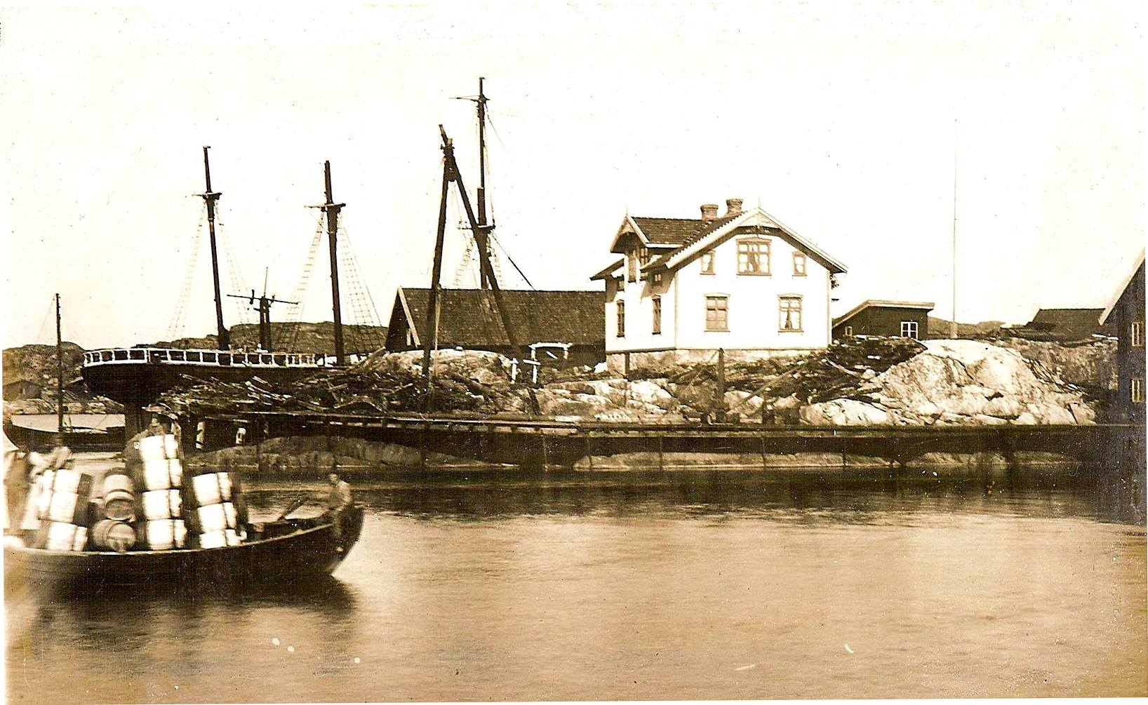 När jag fick se fotot, kom jag att tänka på barken GRIPEN av Kivik, som i maj 1922 såldes till Klädesholmen för upphuggning. Dan lär ha legat, där Sill och salt håller till, men den var mig veterligt aldrig i Skärhamn, innan den bogserades vidare till Torekov för den slutgiltiga upphuggningen. Står boningshuset på fotot fortfarande kvar? Vem ägde, när fotot togs?