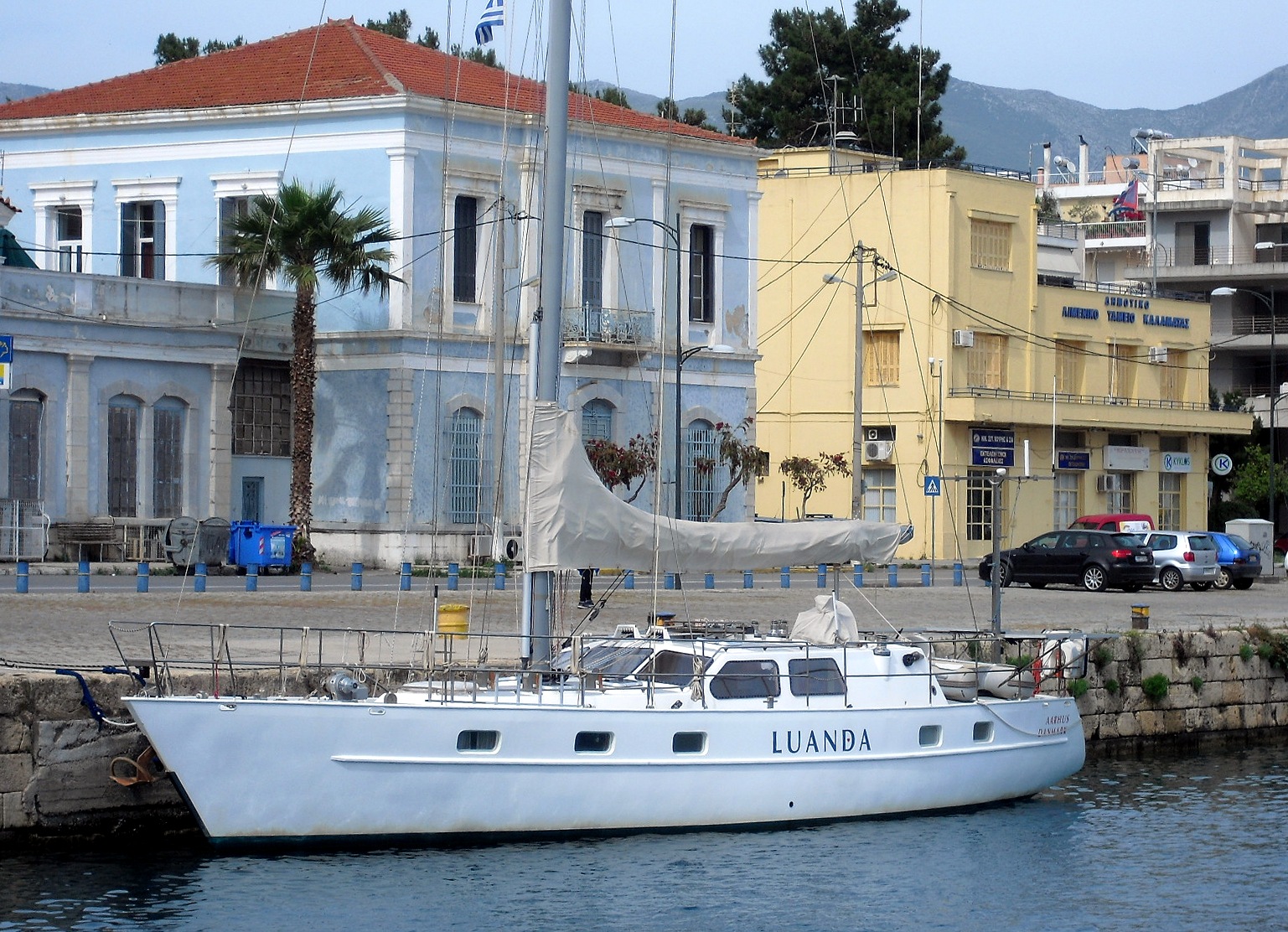 Luanda Aarhus Danmark stod det på långsidan och på låringen av detta flytetyg som jag träffade på i hamnen idag. Något registreringsnummer har jag inte hittat. Hon mäter mellan 15 och 20 meter och är byggd i järn. Nästan inget rost alls så hon är väl behandlad. Hon poserar utanför tullhuset, kanske en tillfällighet. Annars har det varit magert på sistone. Inga fartyg på redden på länge. Vi väntade en tanker, enligt Marine Traffic, men hon ligger stilla sedan flera dygn mellan mellan Syditalien och Kalamata. Det är Primorsky Prospect IMO 9511533 på 113 tusen tdw med Liberia flagg som har destination Kalamata men aldrig kommer. Det hade varit en fin chans med ny kamera att få en bild när hon går in för att ankra. Det kommer en bild på Luanda istället.