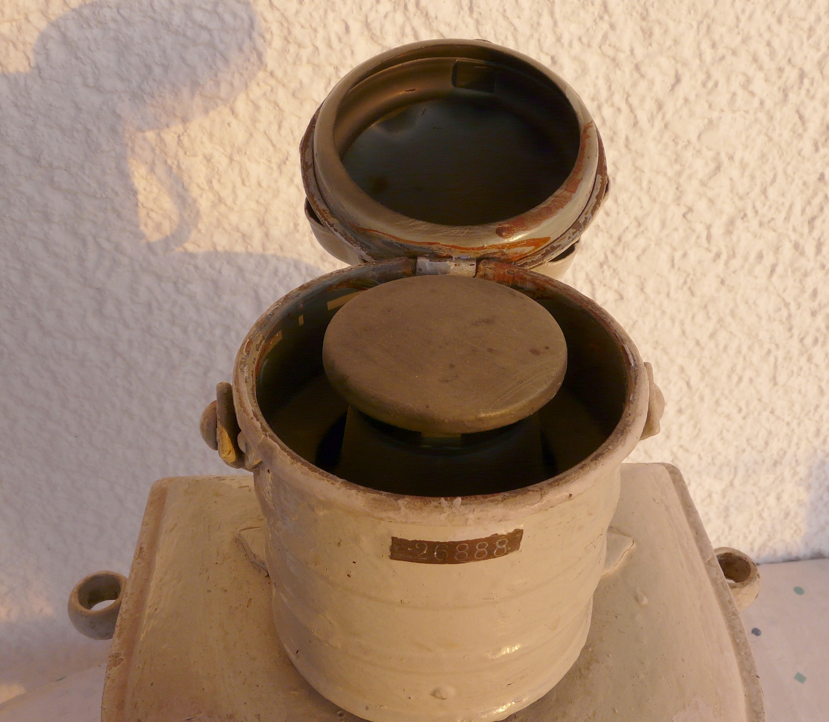 Den här akterlanternan har nog aldrig suttit på någon båt från Skärhamn. Den som jag ärvt den från köpte den på auktionskammaren i Göteborg på sent 1900-tal. När man tittar noga innuti så finns fortfarande svart sot under topplocket. På utsidan av glaset finns inristat ”PTS 26888 7/7 . 55”. 26888 är lanternans nummer för det står även på skylten under topplocket. Därefter ser det ut som datum? Början kanske är signatur. Om det är datum så undrar jag ju om det är 1955 eller 1855 och om det avser tillverkning eller någon senare besiktning. Inga andra inristade datum finns. Nå, vad säger experterna om denna fina akterlanterna?