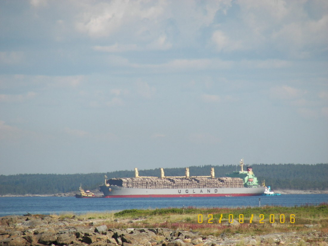 Den här bilden hittade jag nu när jag sitter och bläddrar i mina album. Kortet tog jag 1996. Antingen regnade det så jag sökte skydd i skogen eller också beror inramningen med trädstammar på något anfall av konstnärlig hybris. Kan det vara M/S Sydfart?
