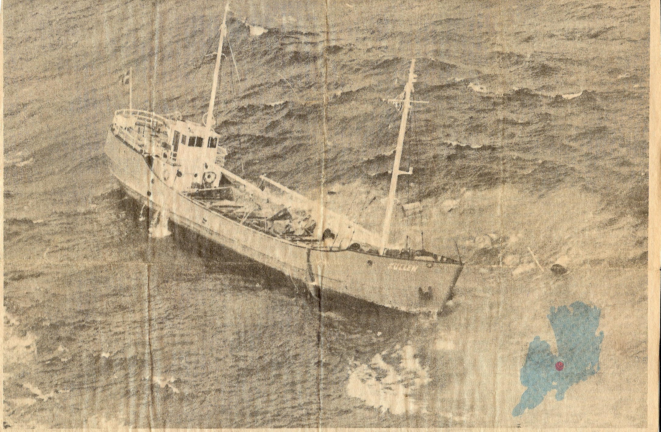 Här kommer Bo Harald,ex. Otterbäcken gick på Carlosgrund mellan Lurö och Kållandsö 12 nov. 1957 Bröts ner under vintern och blev vrak
