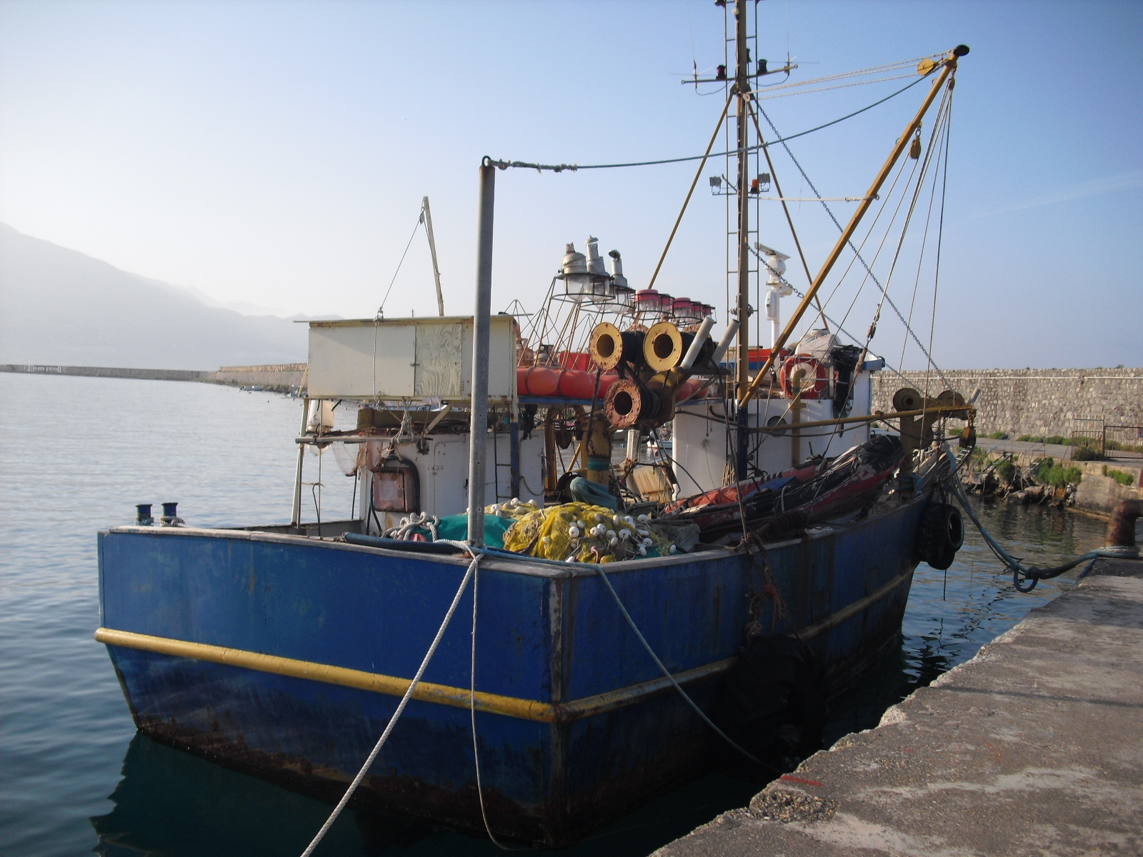 De beslagtagna båtarna inne i hamnen ligger kvar. Det brukar ta tid men att inte den som var utbjuden på auktion blev såld måste väl bero på att skrotvärdet var för lågt för att även räcka till bogsering till Aten. Nu ligger den och drar hamnavgifter och det blir väl staten som får ta den smällen så småningom. Den affären måste bli sämre för varje dag som går. Men det är ju staten som skall ha hamnavgifter också. Mig gör det inget om den ligger kvar, jag har ju något att titta på när jag passerar. Utöver denna skorven som blev stoppad av besiktning så ligger där några mindre smuggelbåtar och en fiskebåt som gått i konkurs. Jag har en bild på den som kommer separat. Hej så länge.
