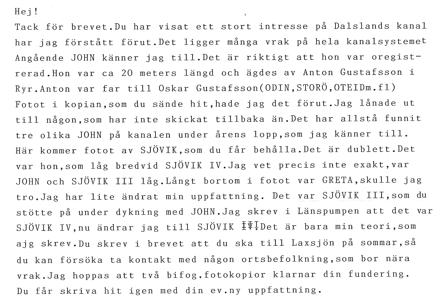 Det var också intressant att få en bekräftelse på att ångfartyget Greta var ett av de fartyg som har legat som vrak i just den viken. Jag har under lång tid spekulerat om detta, efter att ha läst en artikel om Dalslands kanalbåtar i boken "Hembygden" som gavs ut av Dalslands Fornminnes- och Hembygdsförbund år 1968. Artikelförfattaren Wilhelm Ängermark skriver följande om Greta: