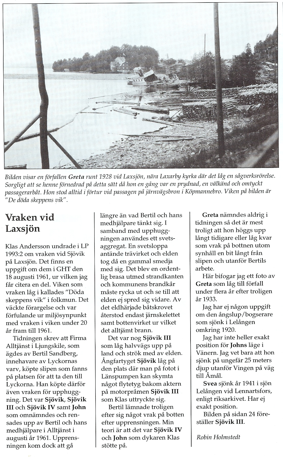 Tack för den intressanta beskrivningen av vraken i Laxsjön! Jag kände inte till att det har legat fartygsvrak på flera platser i viken, men den nya kunskapen förklarar varför jag har en minnesbild av flera fartyg som låg tillsammans vid ett tillfälle, medan jag bara såg ett vrak när jag besökte platsen igen, långt senare. Nästa gång jag passerar Laxsjön ska jag stanna till och titta bättre, lite längre väster ut.