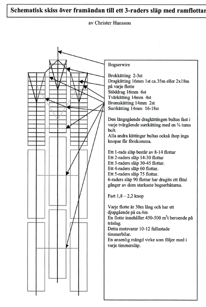 Mindre släp kunde man dra direkt i de längsgående kättingarna, men på större släp bultade man ett v-format drag av kätting. De första ramarna satte man ihop även i akterändan, men resten av ramarna hängde fritt i varsin rad. Undantag fanns dock. Sura björkramar som flöt dåligt kunde behöva hängas upp mellan ett par granramar.