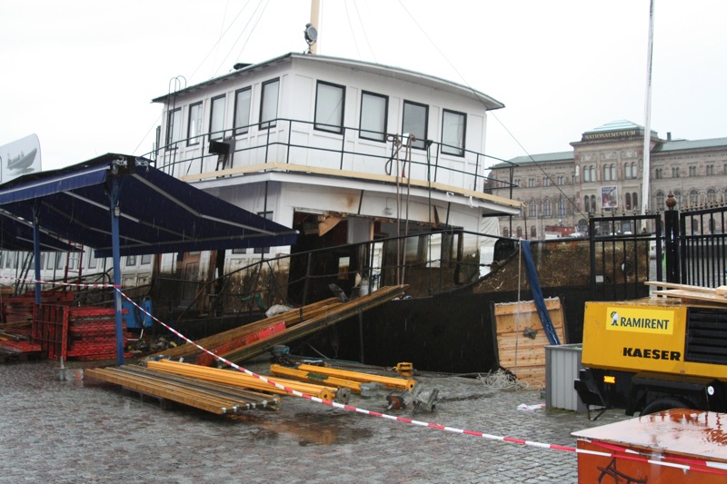 (Sjösidan är en resturang båt i betong som sjönk i somras, i sthlm, nedanför slottet.)