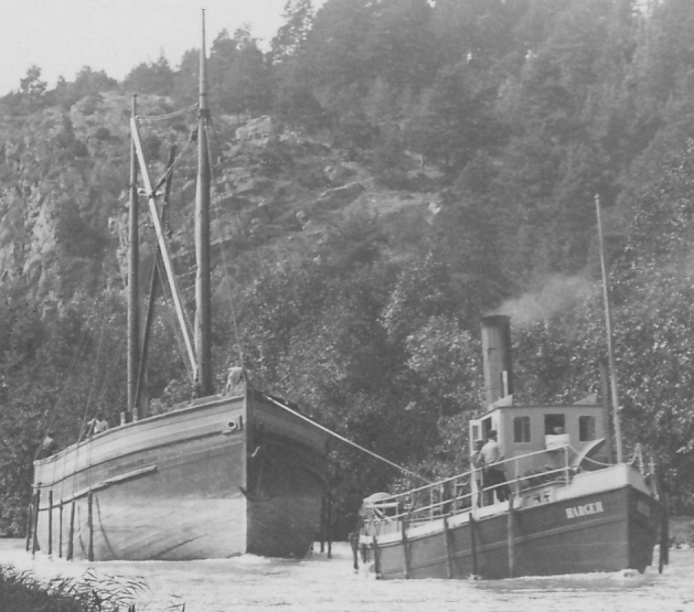 Båt nr 2: HARGE II b 1902. Ses med pråmen FREY för att hämta tändstickstimmer från Ryssland i Mem (egentligen Baltikum väl, samma import pågår än i dag, men med andra slutprodukter, till Västervik och sedan med tåg till Rottneros pappersbruk, av just asptimmer).